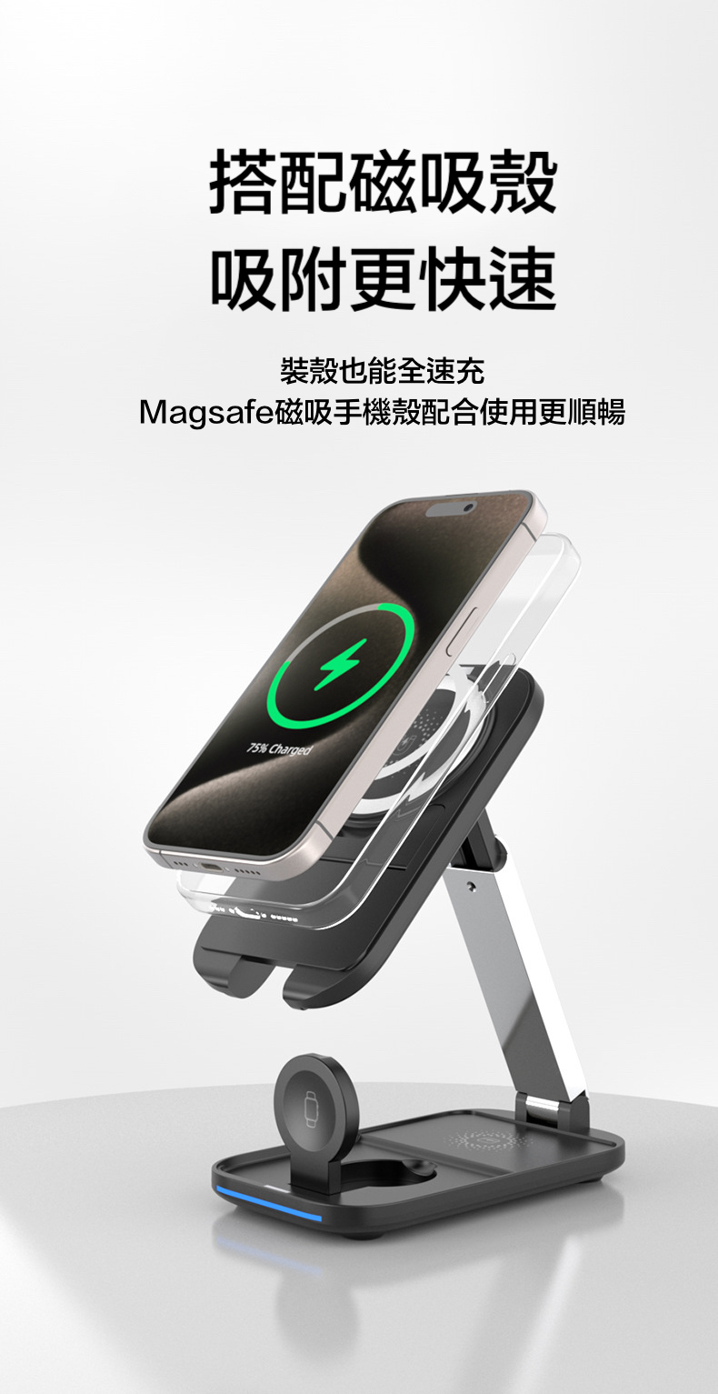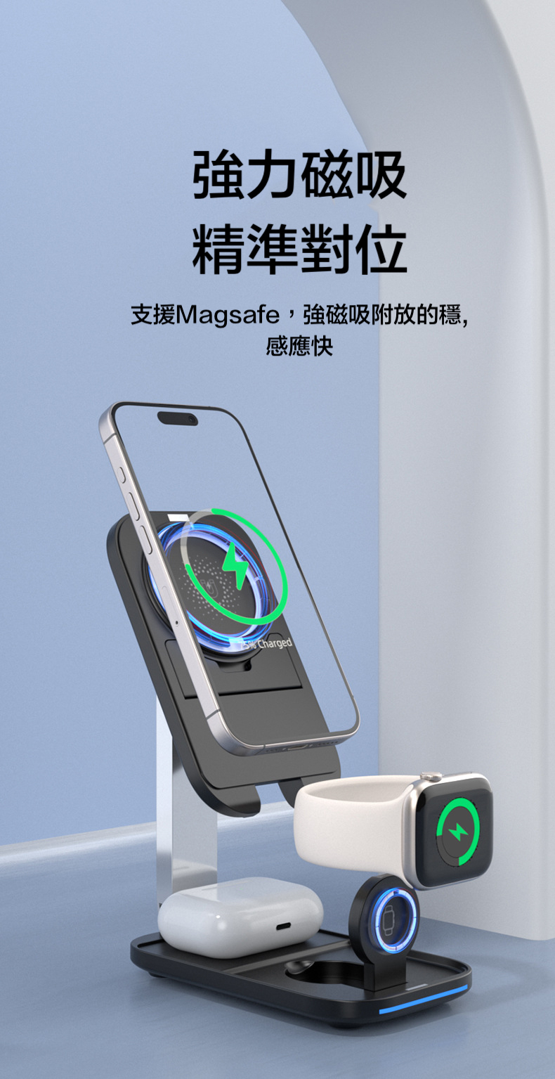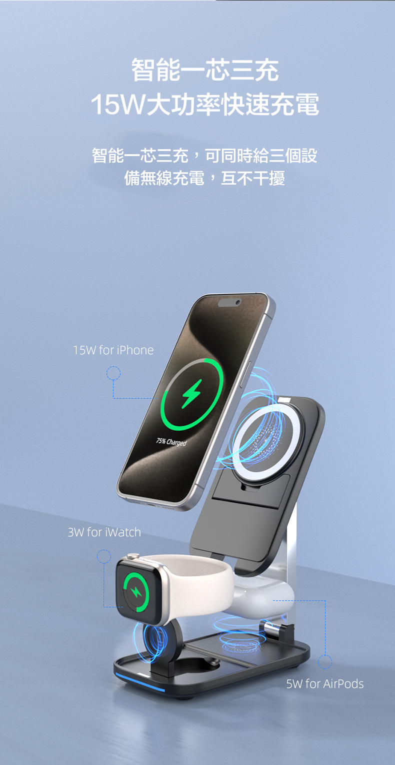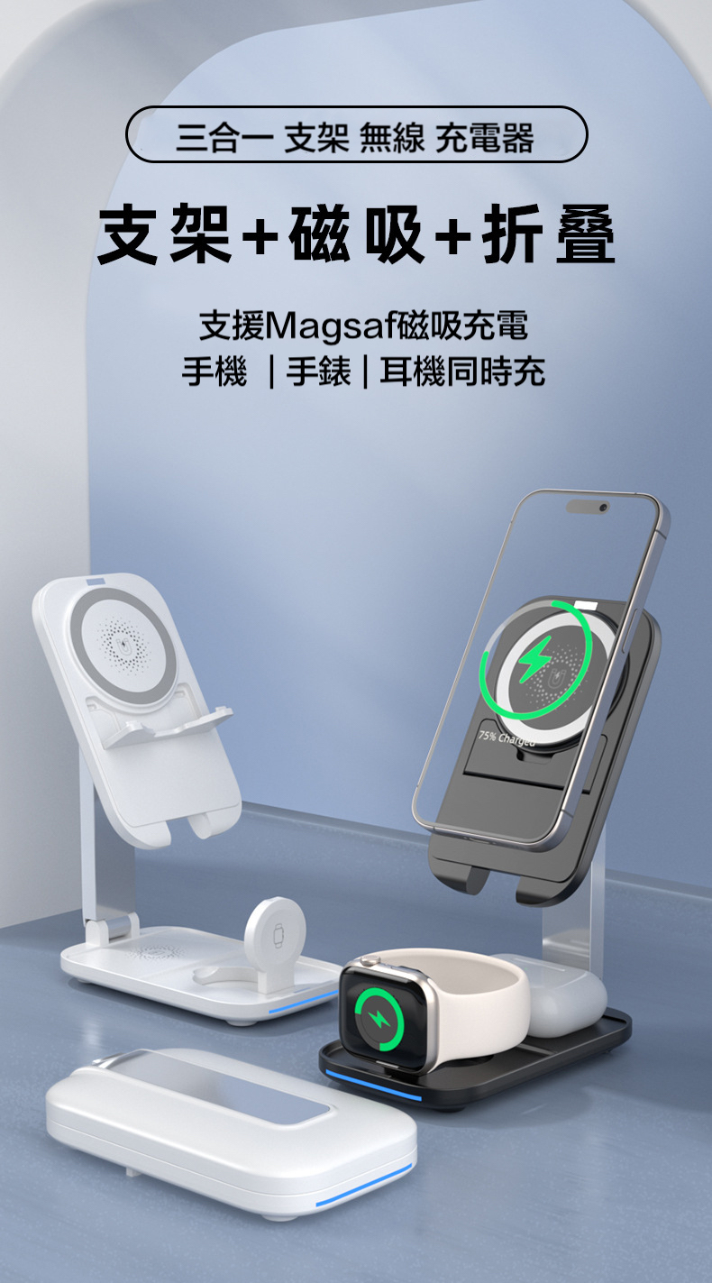 【15W三合一折疊magsafe支架充電器】 可伸縮可折疊,15W快速充電,同時支援apple watch及earphone無線充電