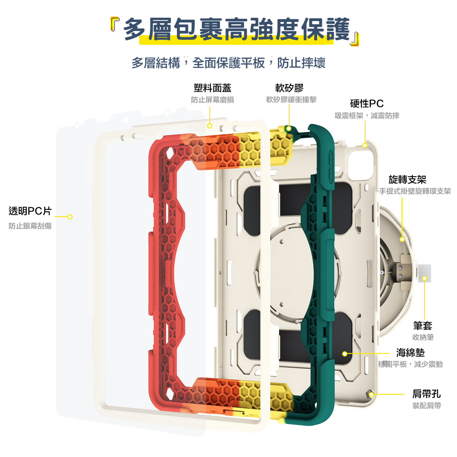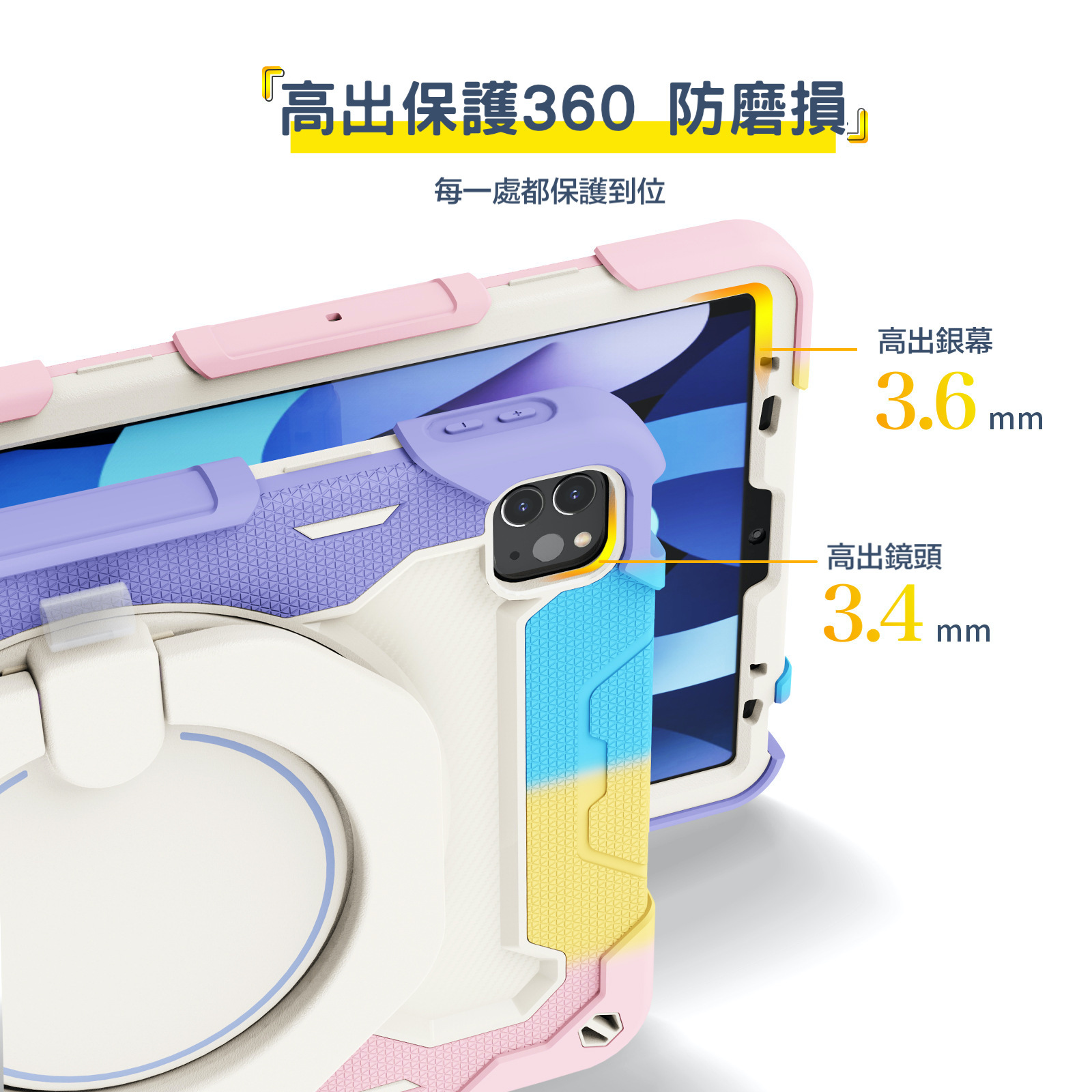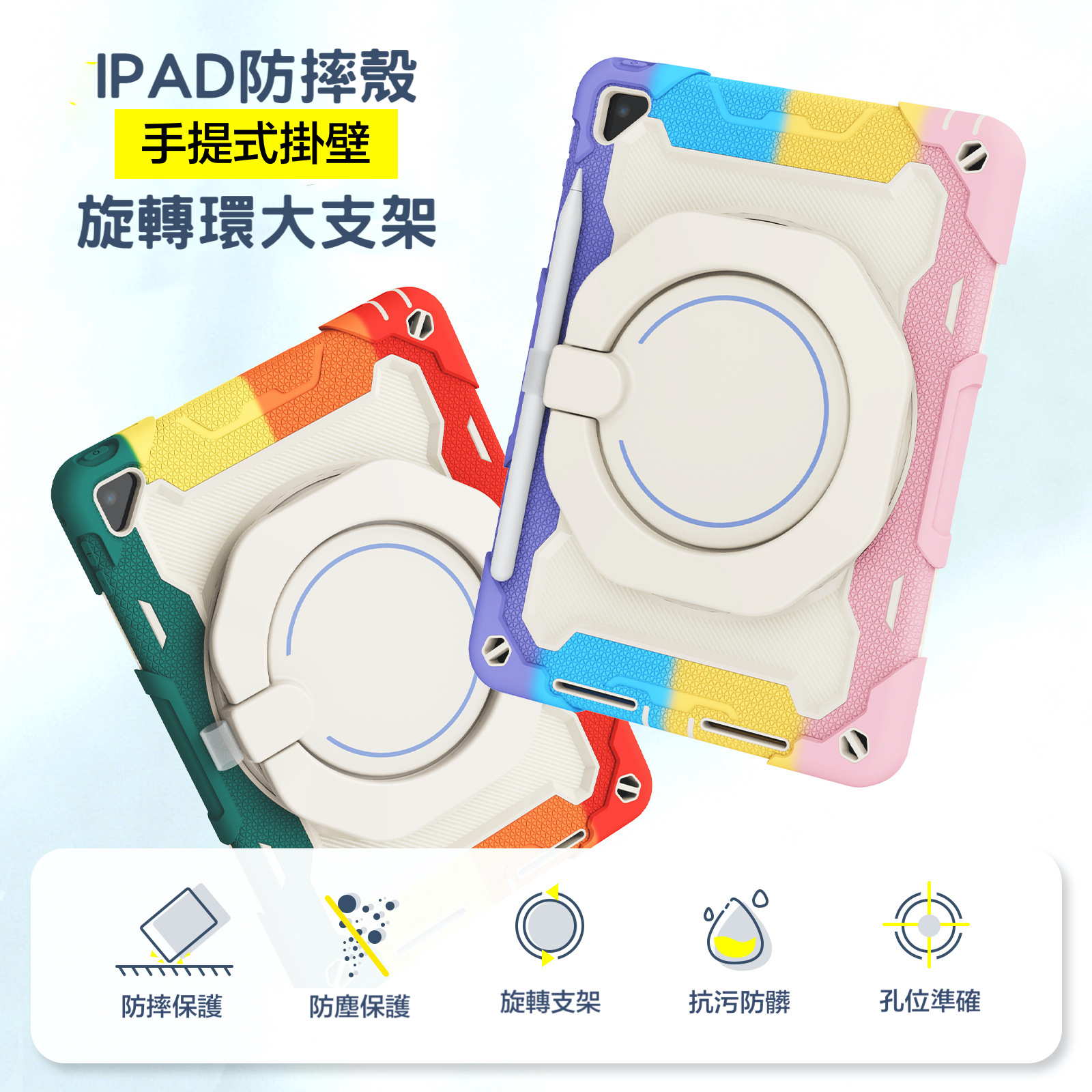 防摔、防塵、旋轉支架、抗污防髒、孔位精準