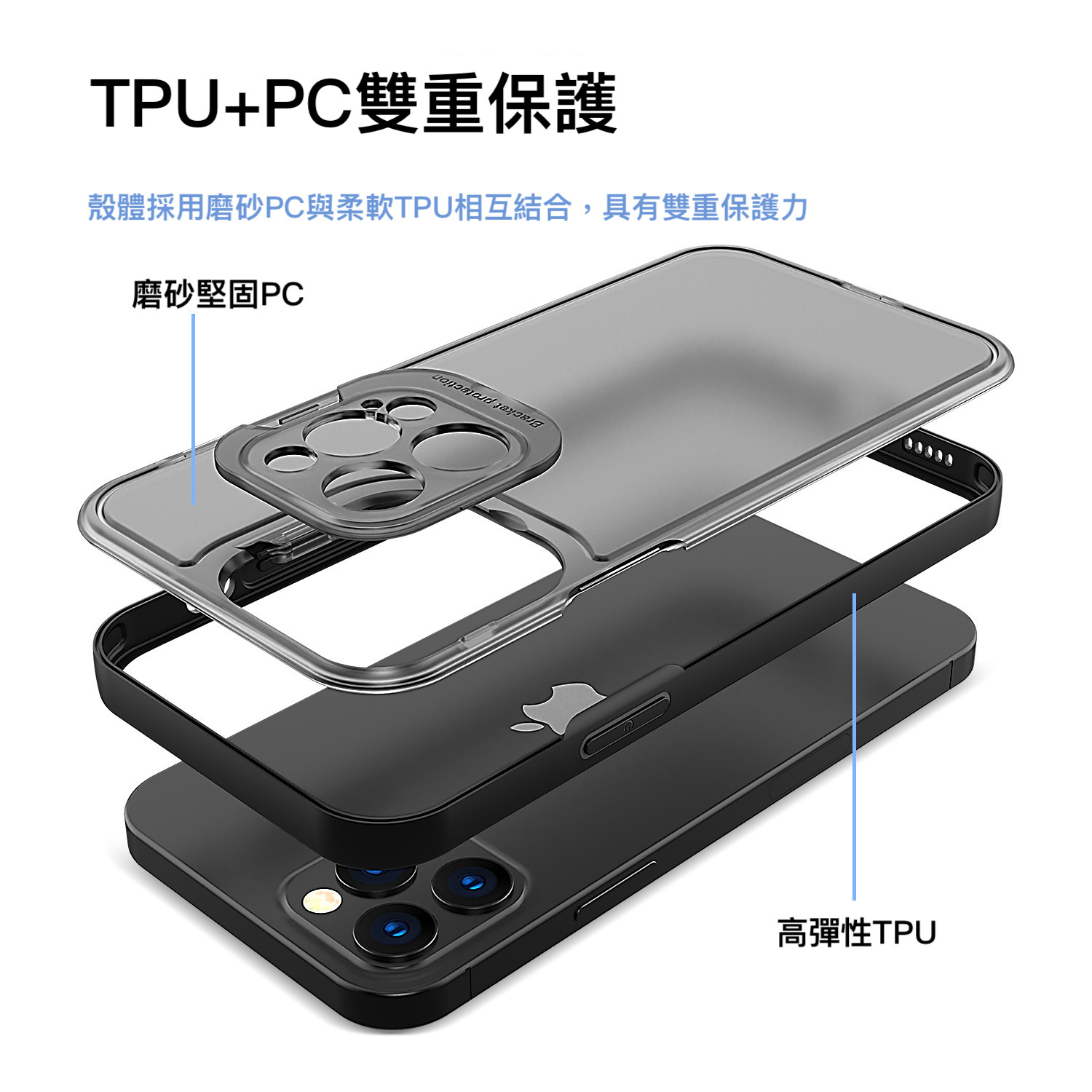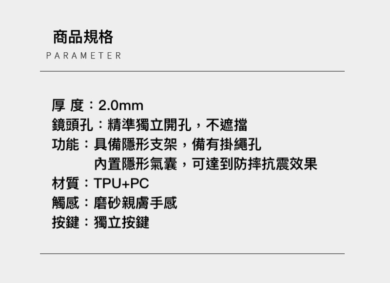 護殼材料 : 磨砂PC+TPU軟邊