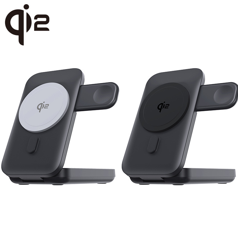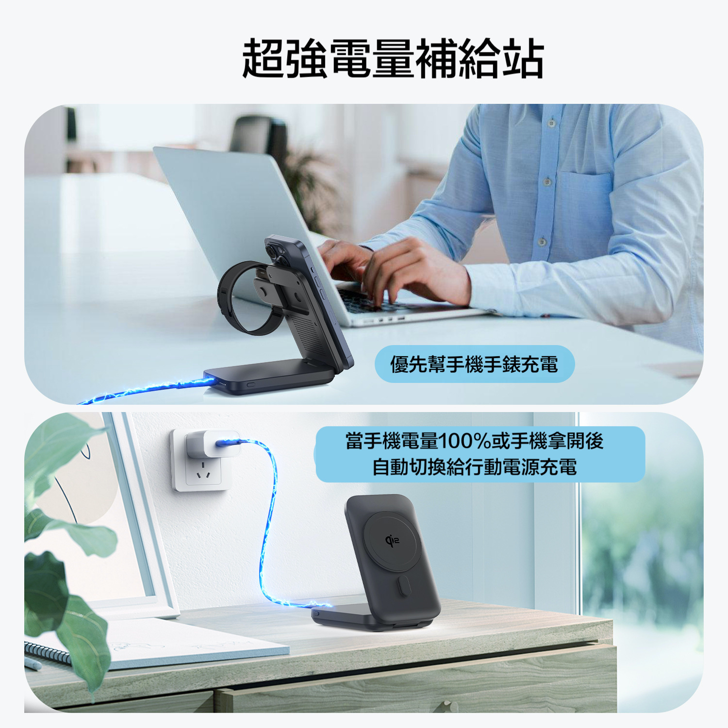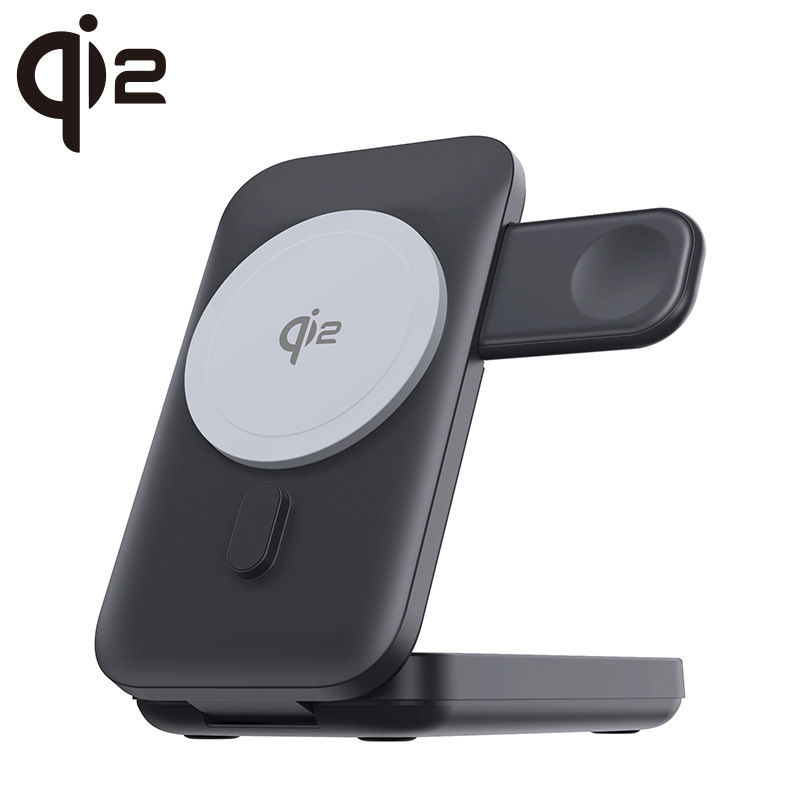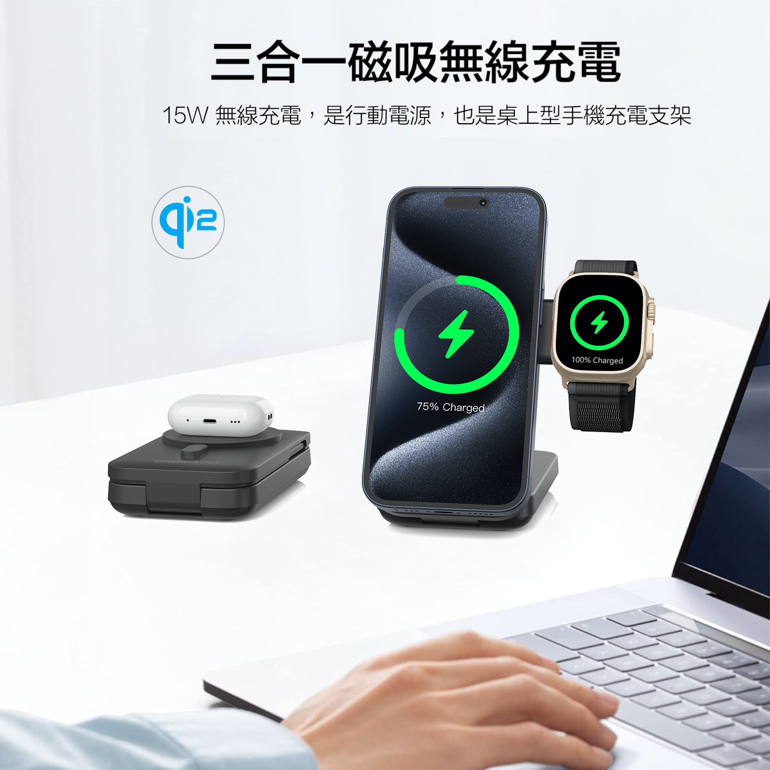 最新無線充電協議QI2, iphone 12以上的手機無線充電效能可以達到15W(以往magsafe充電效能約7.5w) ,本身是10000mAh行動電源,具有支架功能,可直接變身桌面支架,獨立手錶無線充充電阜,可以一邊充手機,一邊充手錶。當手機、手錶滿電或者移開時,就會自動幫行動電源充電。