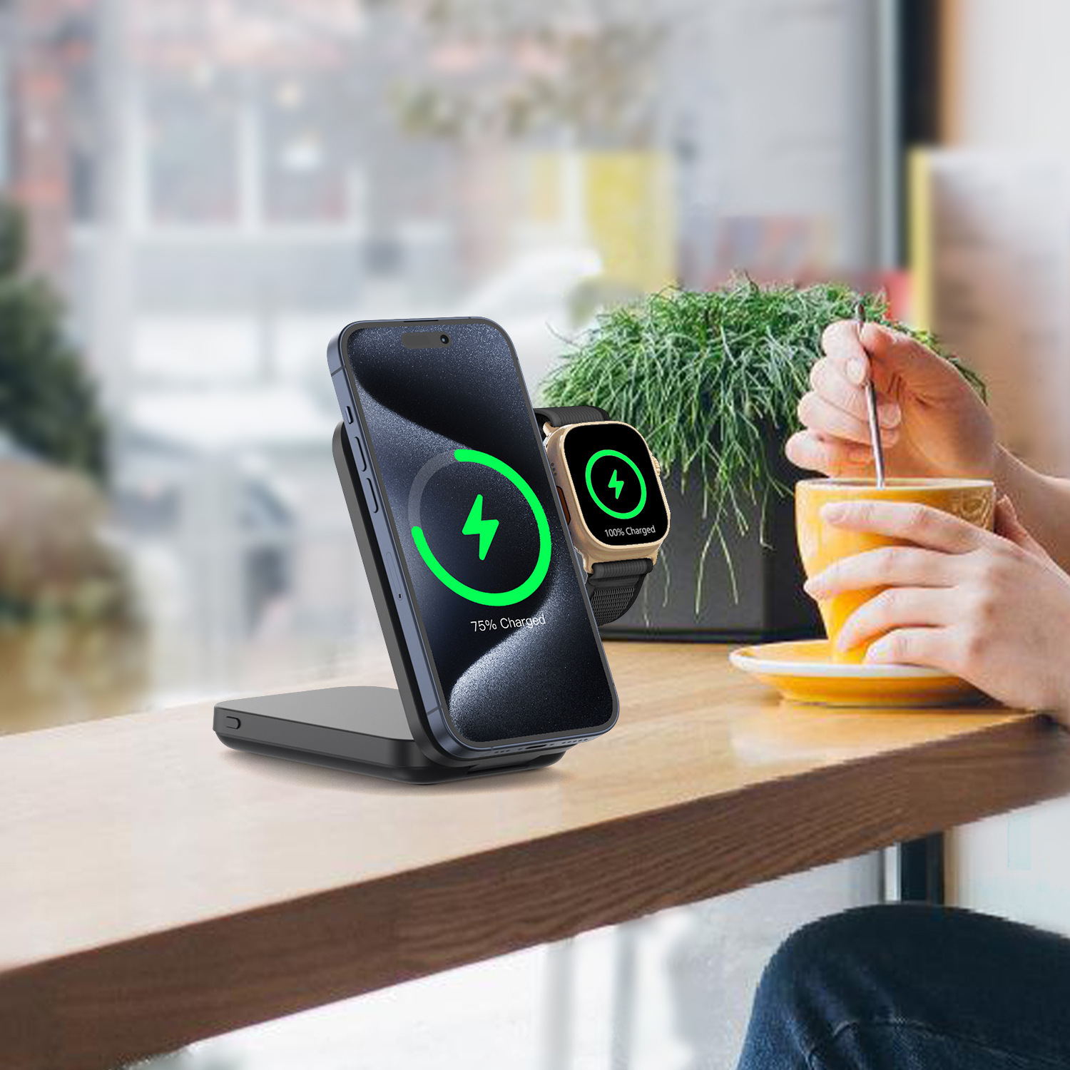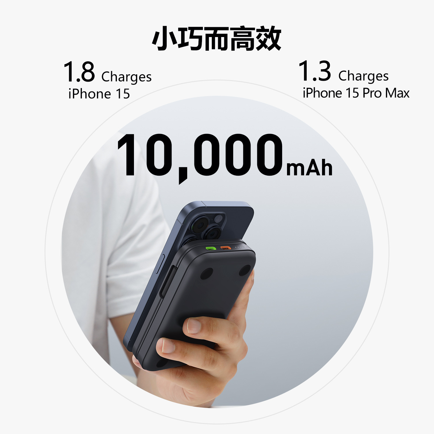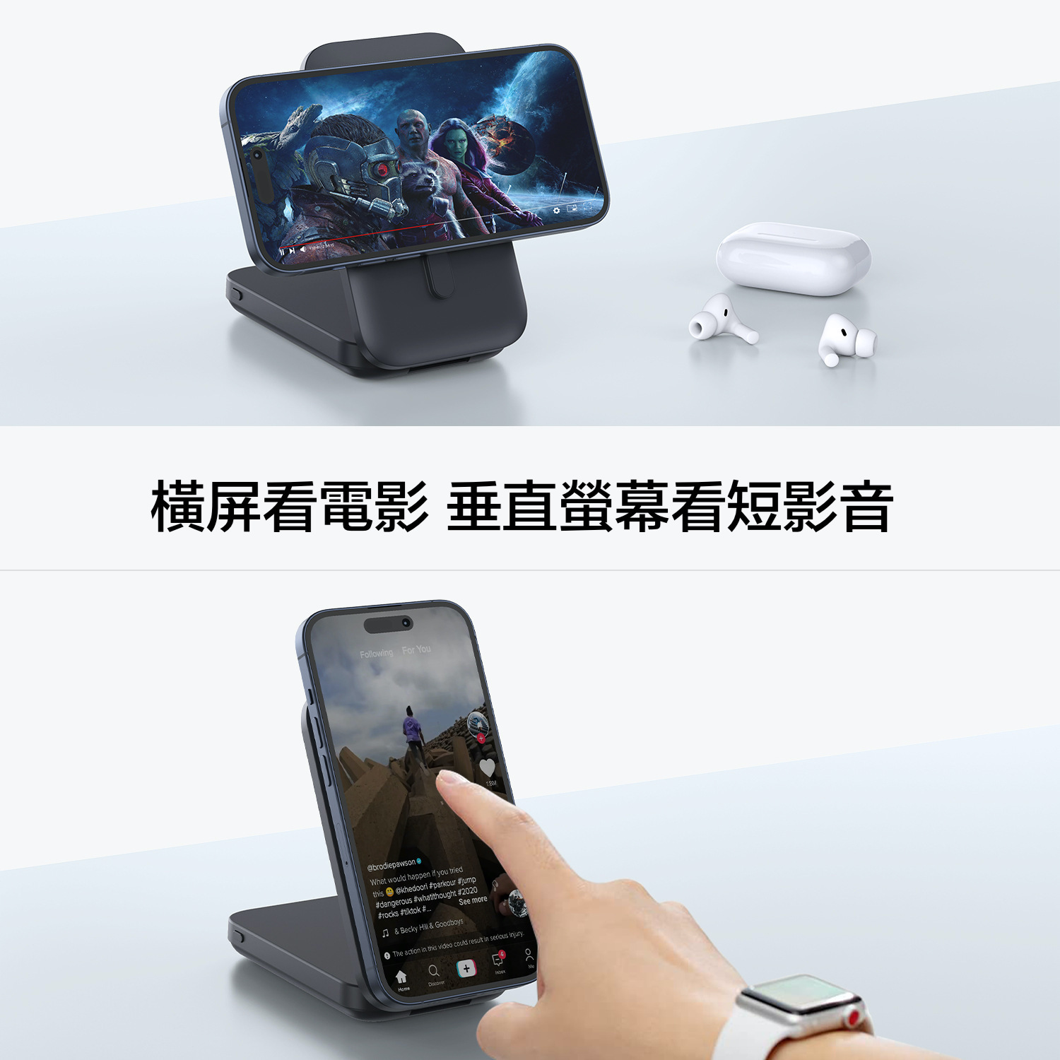 最新無線充電協議QI2, iphone 12以上的手機無線充電效能可以達到15W(以往magsafe充電效能約7.5w) ,本身是10000mAh行動電源,具有支架功能,可直接變身桌面支架,獨立手錶無線充充電阜,可以一邊充手機,一邊充手錶。當手機、手錶滿電或者移開時,就會自動幫行動電源充電。