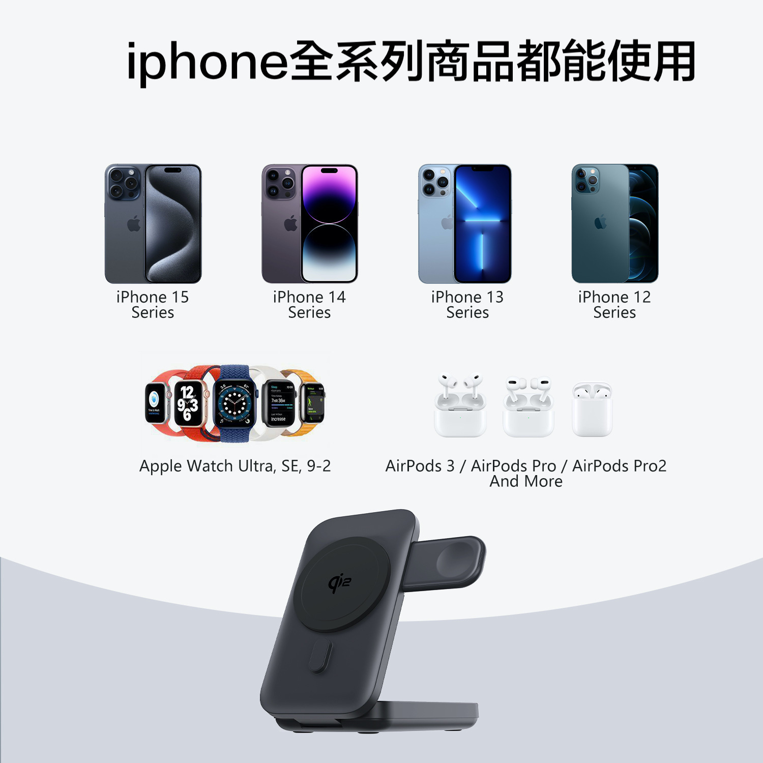 最新無線充電協議QI2, iphone 12手機的無線充電效能可以達到15W(以往magsafe充電效能約7.5w) ,本身是10000mAh行動電源,具有支架功能,可直接變身桌面支架,獨立手錶無線充充電阜,可以一邊充