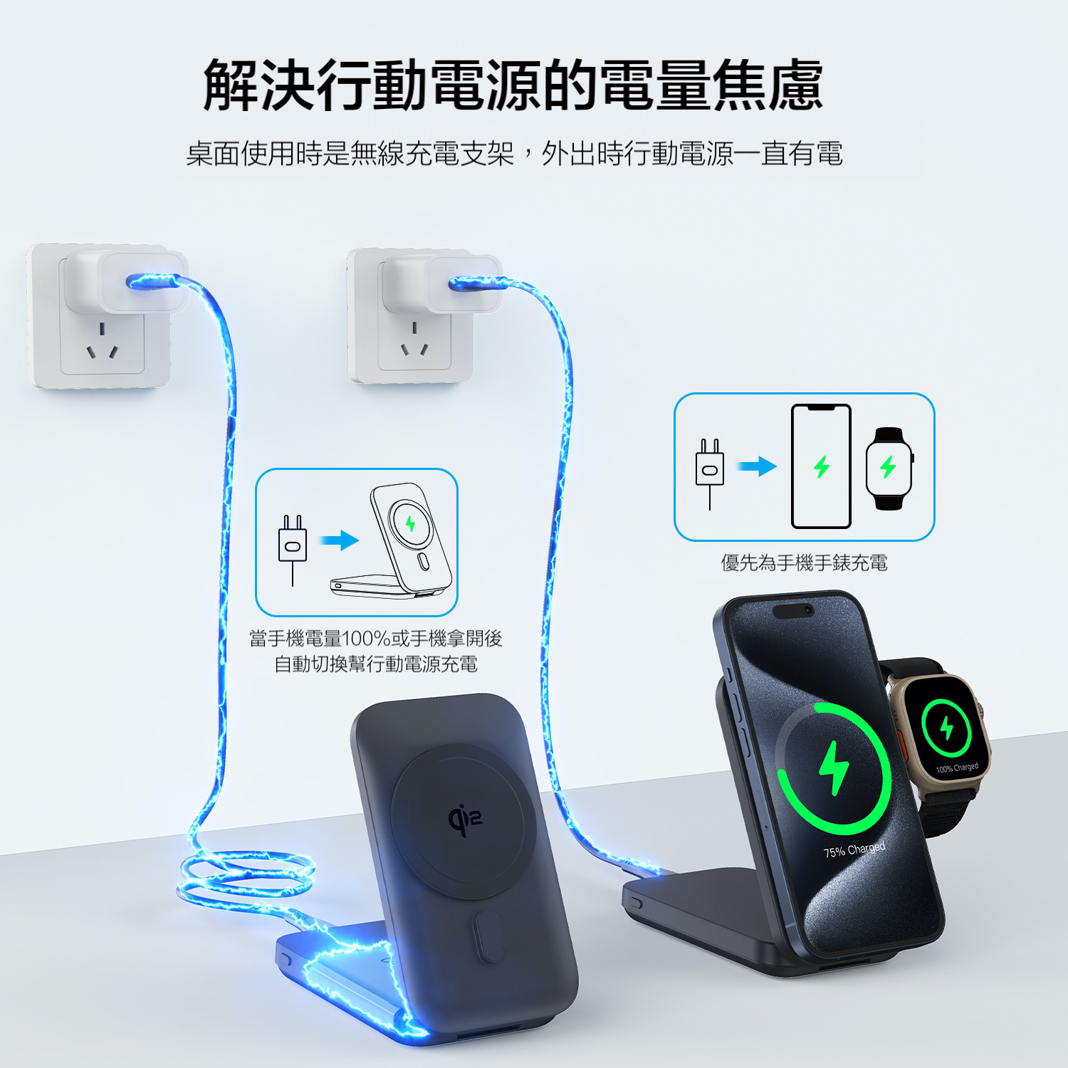 🛑 桌面使用時,優先給手機快速無線充電。當手機充滿100%或手機拿開後,自動切換為電池充電。當您外出時,行動電源的電量永遠保持有電。