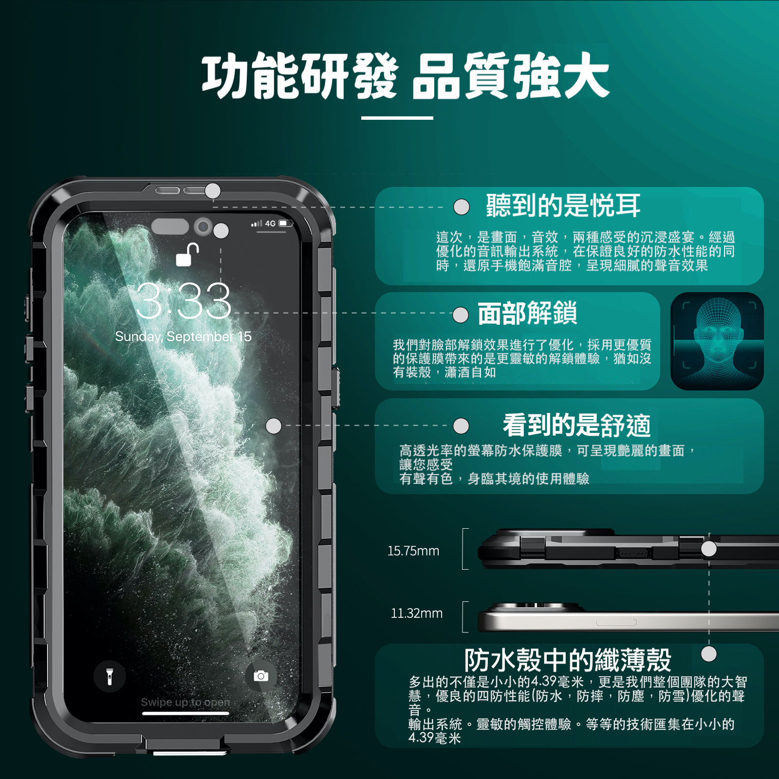 此款商品屬於極度防水的全密合保護殼,結構緊密通過IP68測試實驗,不論是雨天,海邊玩水浮淺游泳,登山等等重量級的活動,通過密合式全包覆的手機殼可讓您的愛機通暢無阻。