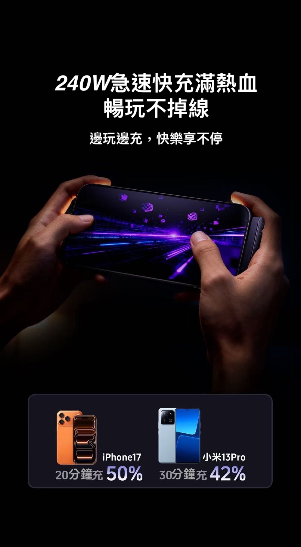 ◆ 240W超快速充電效能,讓您的iphone17快速滿電