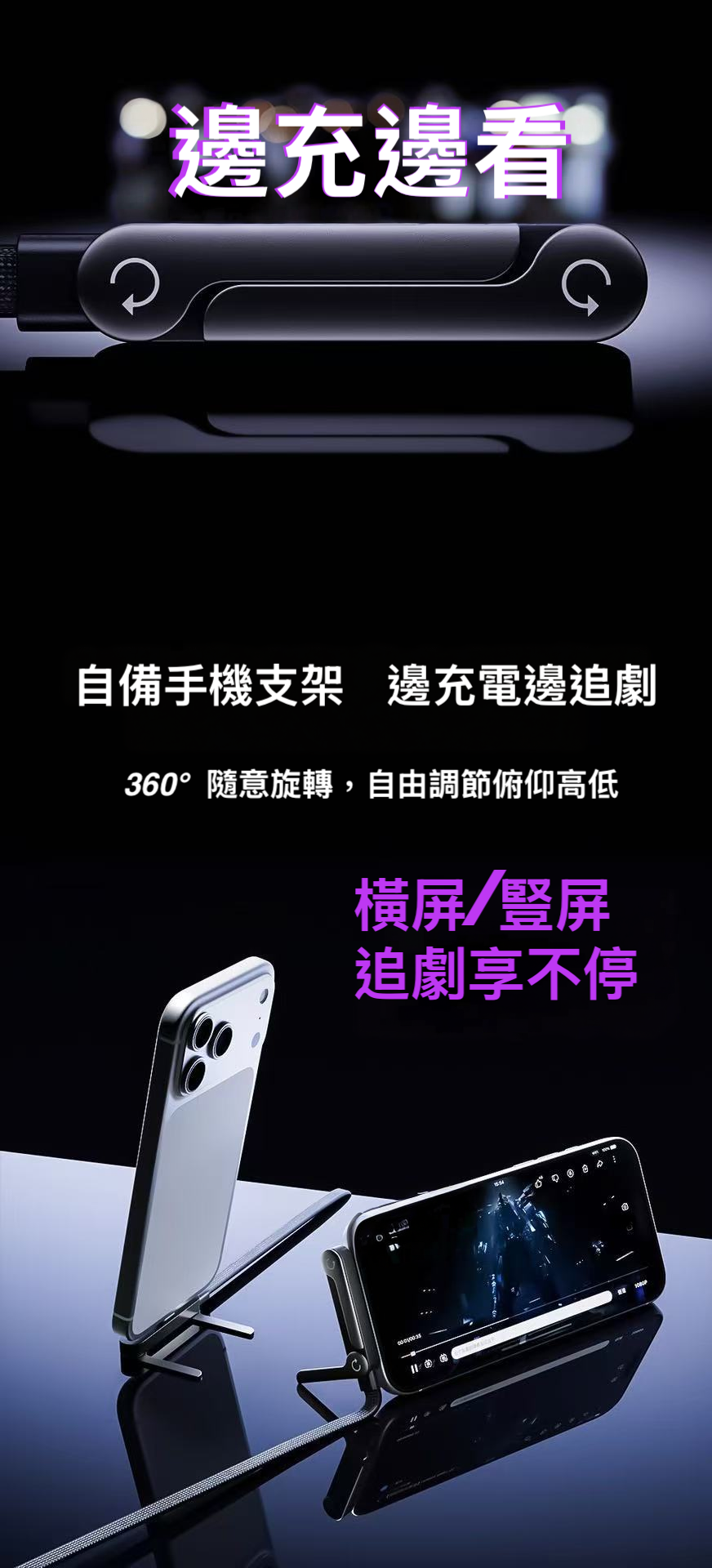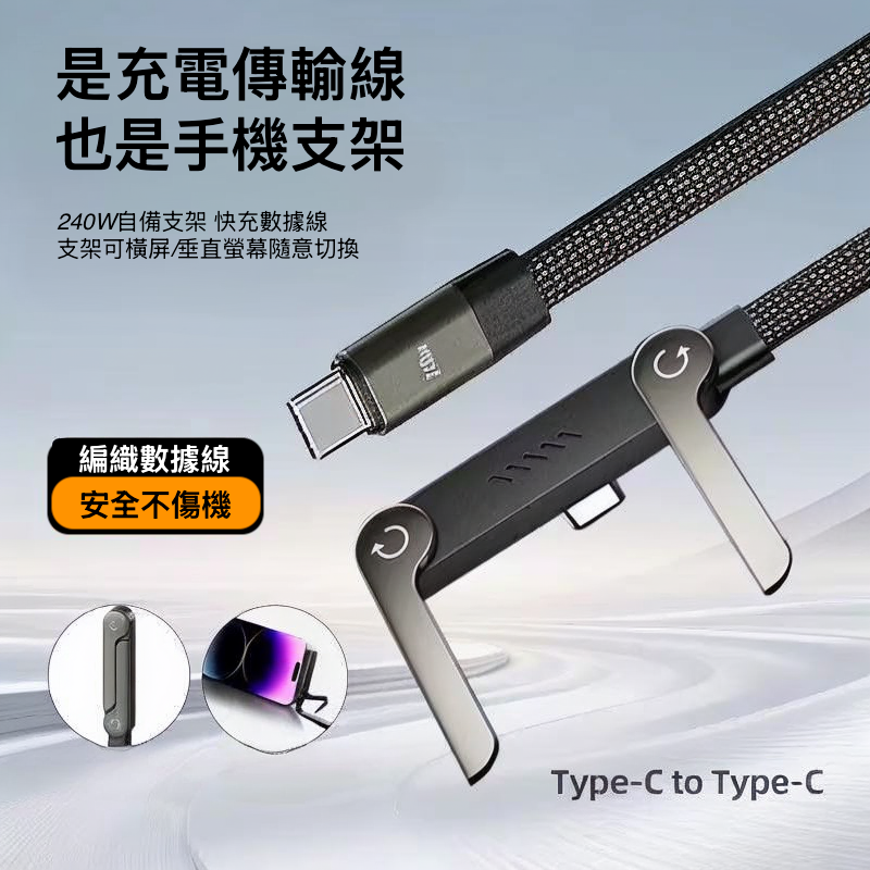 『可當支架』240W急速充電傳輸線, 雙type-c 支架充電二合一【最好用的充電線】快充效能 1m/1.5m