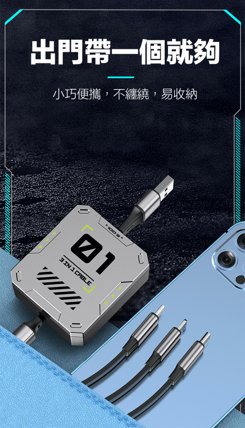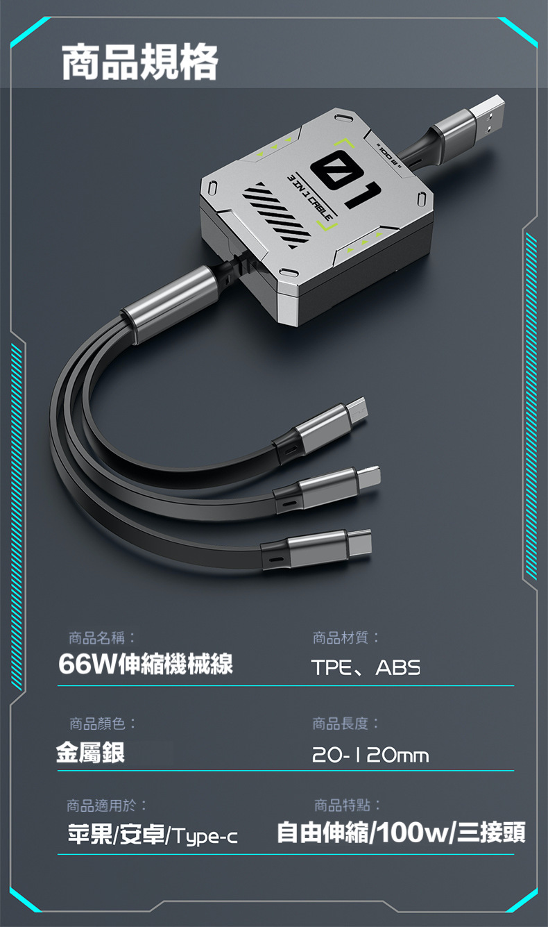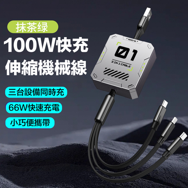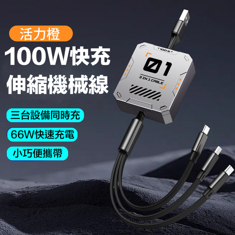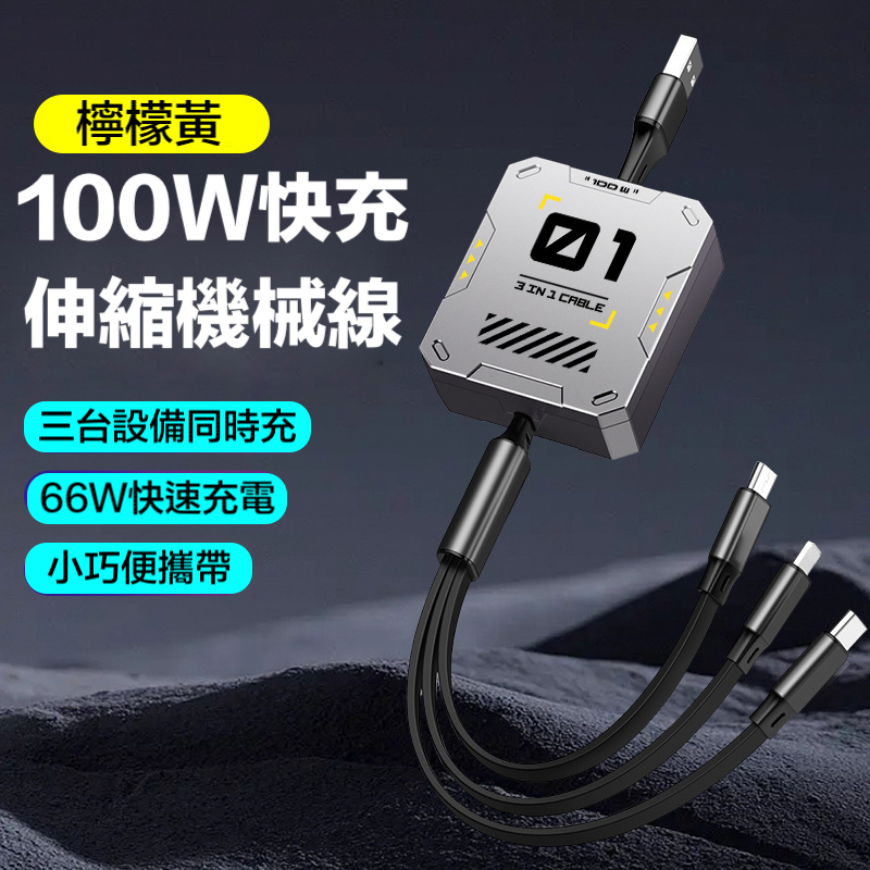 【100W機械伸縮線】100W快充效能,伸縮收納20~120cm隨你拉~一線3頭(安卓+apple+TYPE-C)