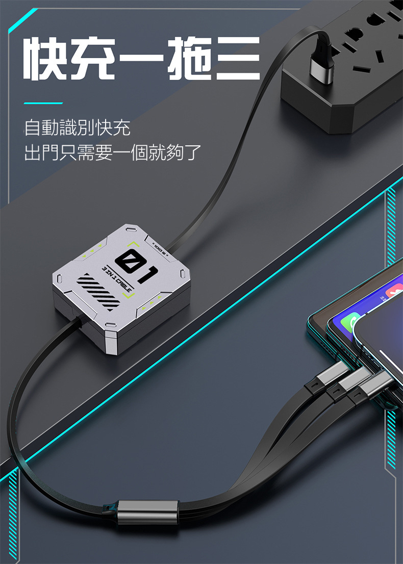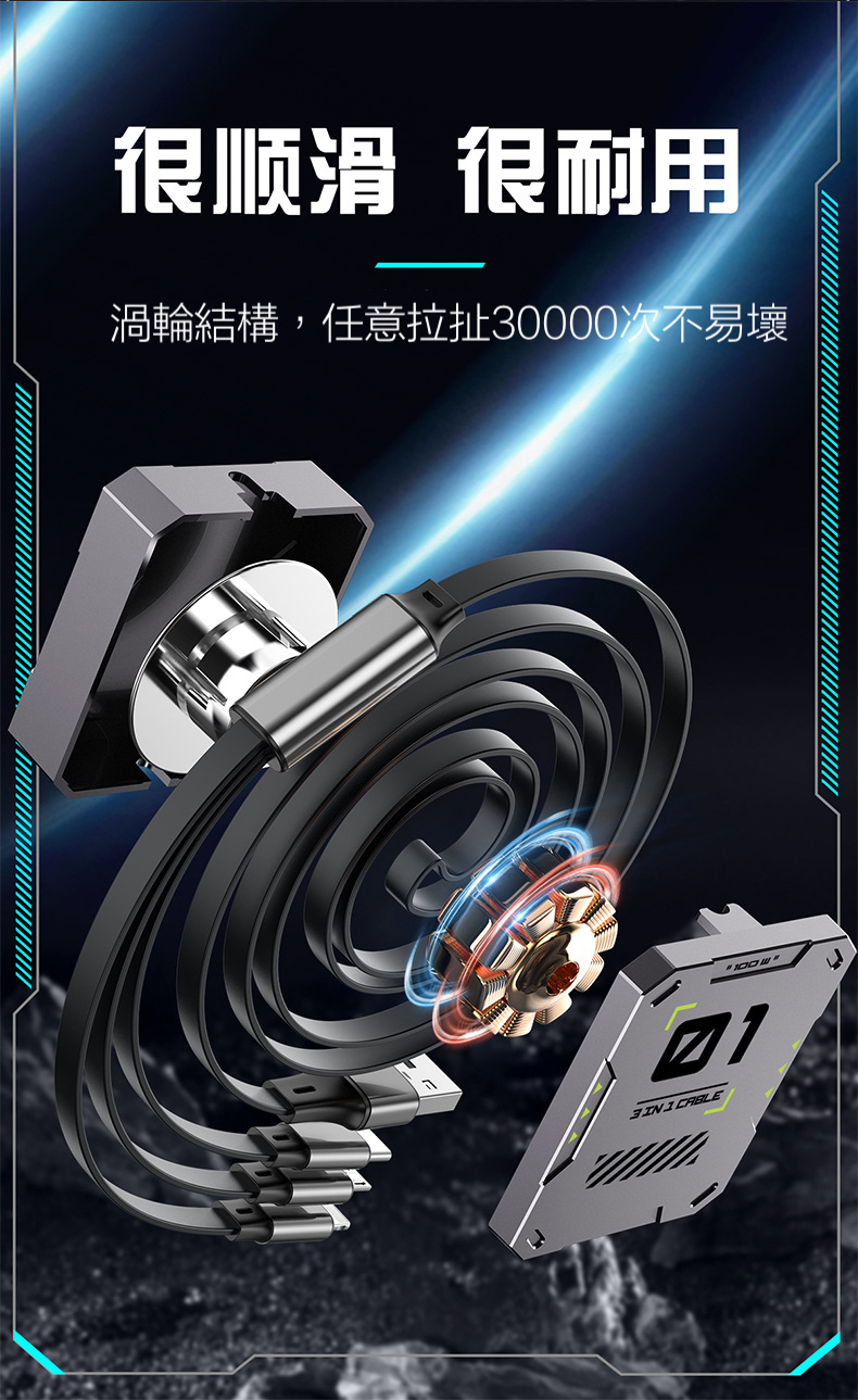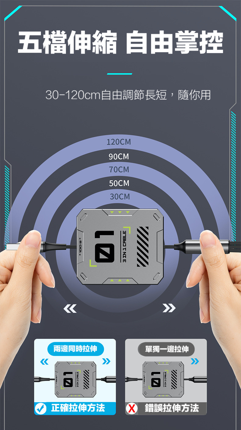 【100W機械伸縮線】100W快充效能,伸縮收納20~120cm隨你拉~一線3頭(安卓+apple+TYPE-C)