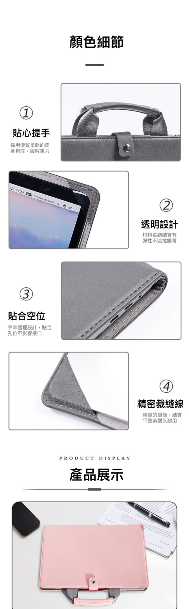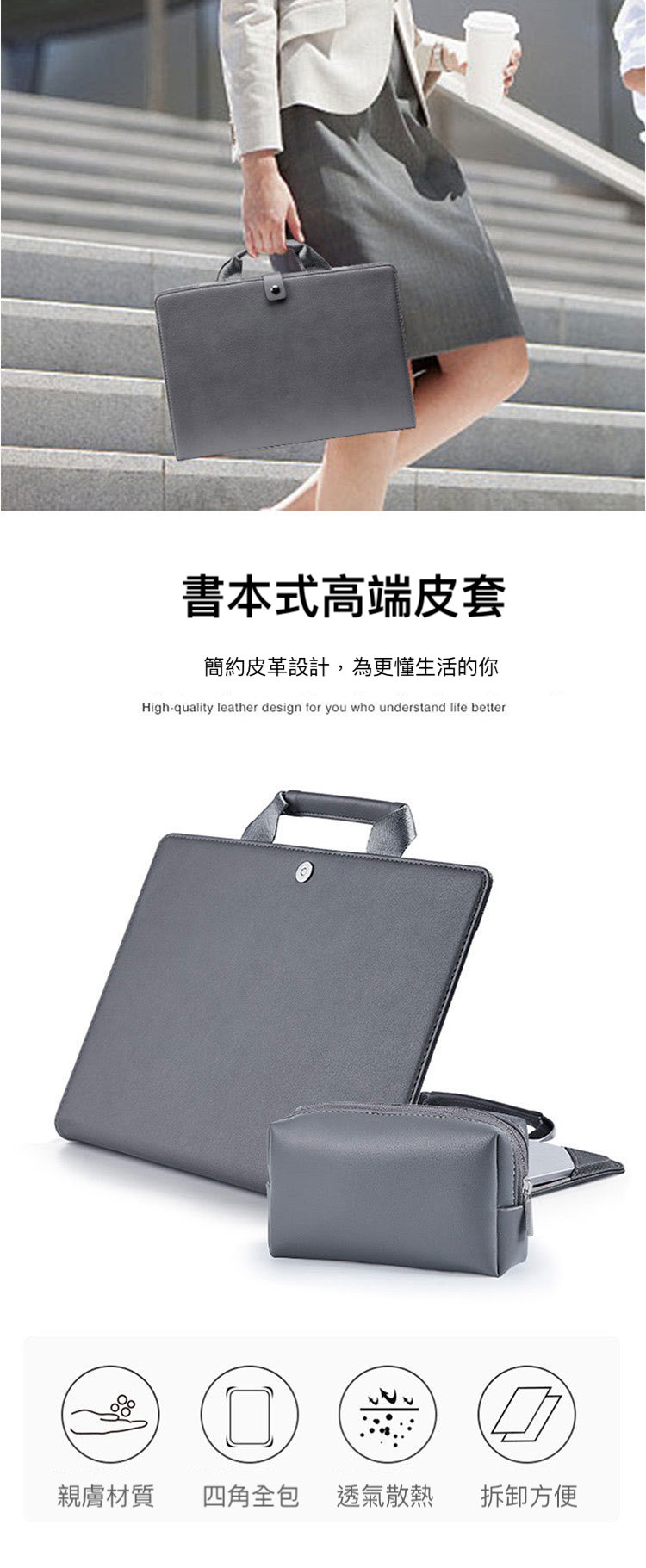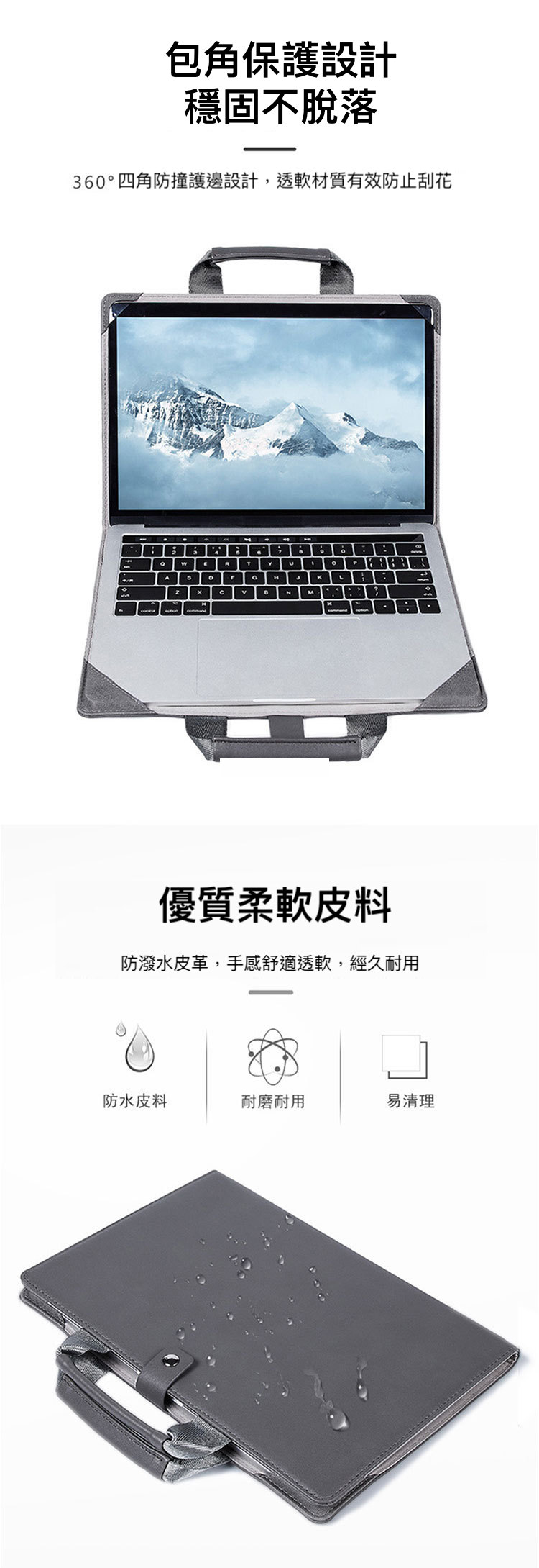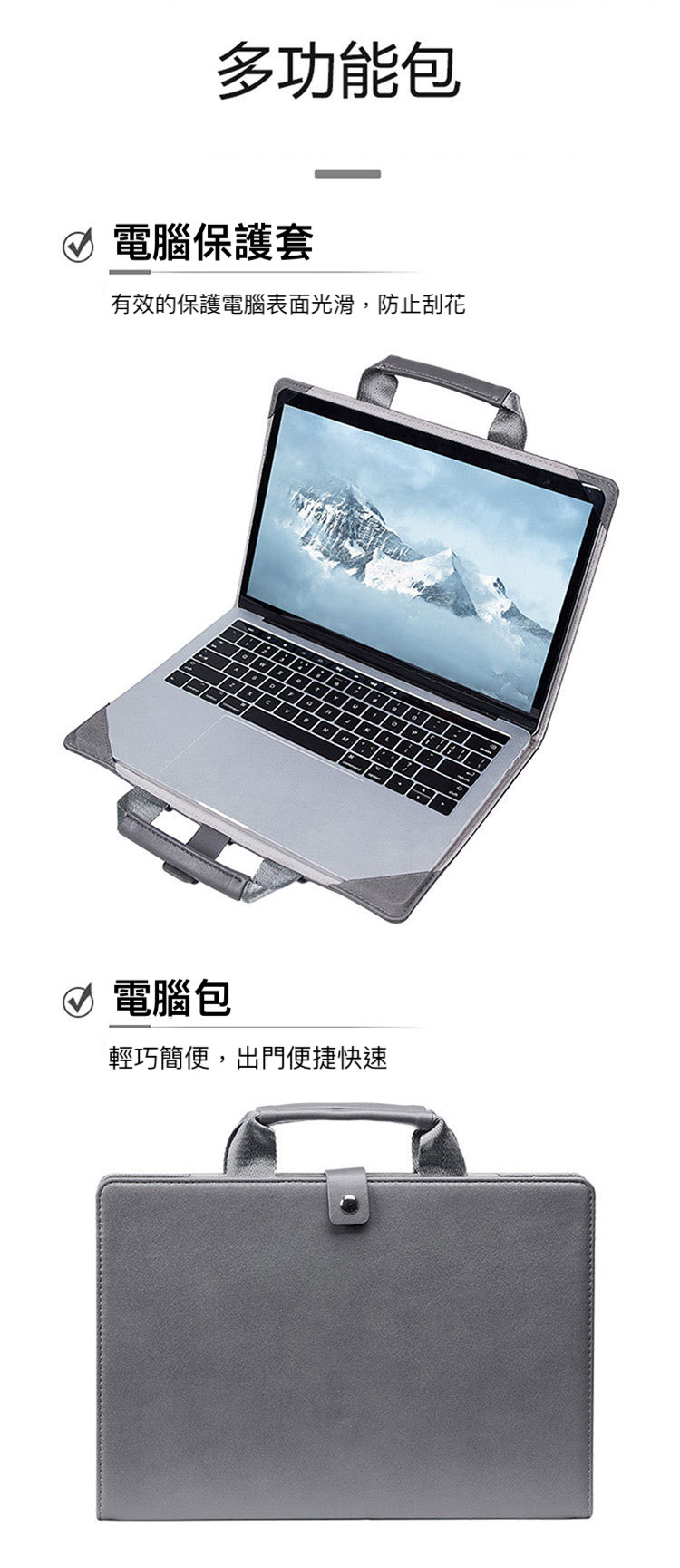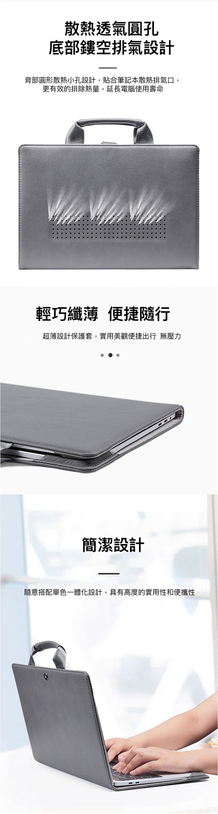 這是一款兼具手提筆電包、保護套的多功能電腦包,直接翻開筆電就能使用;防水易清理,下方還有簍空散熱孔,可有效的排除熱量,延長電腦使用壽命