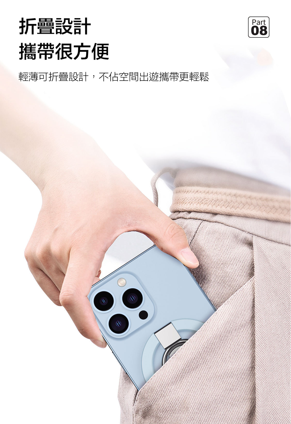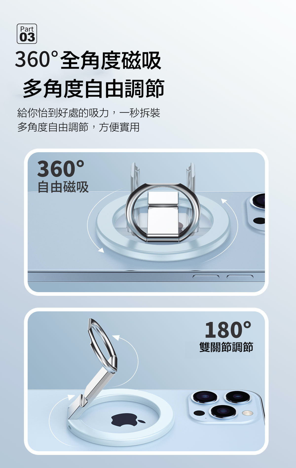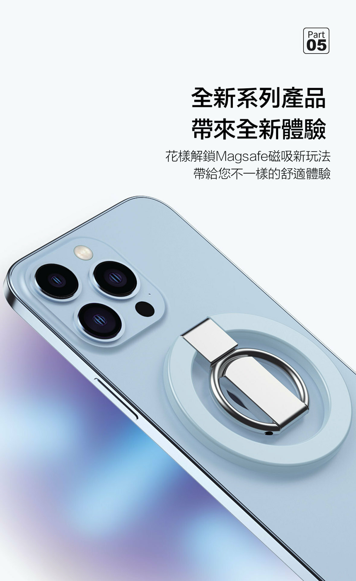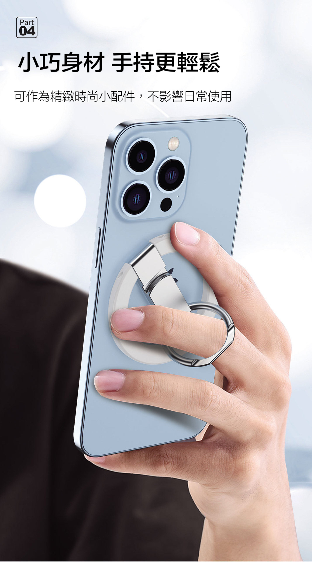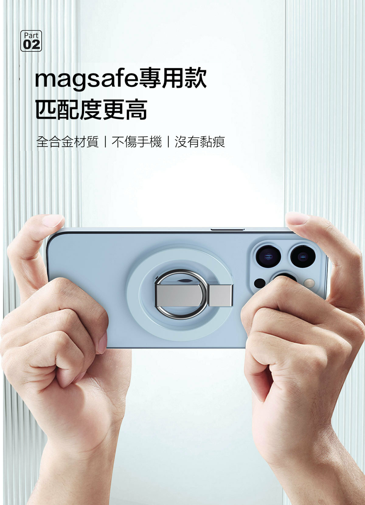 Magsafe磁吸指環支架,憑藉其獨特的磁吸設計,只需輕輕一貼,即可與您的手機完美結合。它不僅可以為您提供穩固的支撐,讓您在看影片、遊戲或視訊通話時,享受更舒適的體驗,也能隨時隨地滿足您的不同需求。
