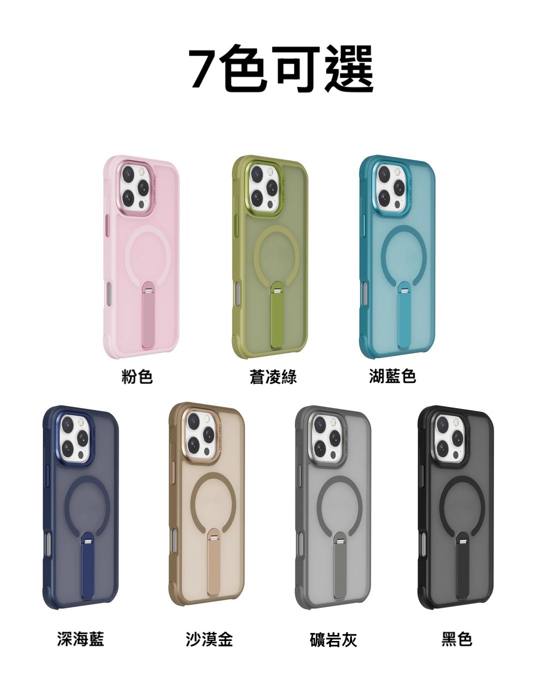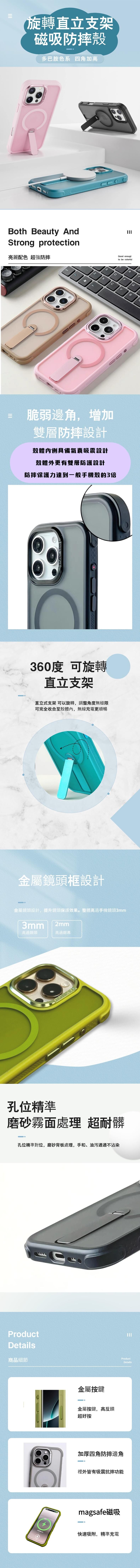直立旋轉支架設計,搭配17顆N52磁吸穩定定位,使用更順暢。TPU+PC雙材質結構,四角加厚氣囊防摔設計,通過SGS軍規測試,提供卓越抗衝擊保護。3.0mm磨砂背板抗指紋、防髒污,隱藏式支架180度可調,實用性強。精緻金屬鏡頭框,7色可選,適用多款iPhone機型。