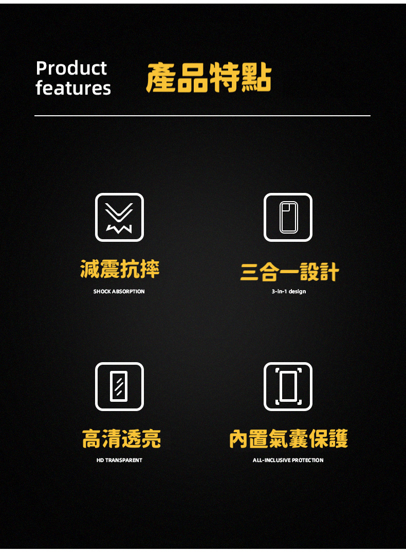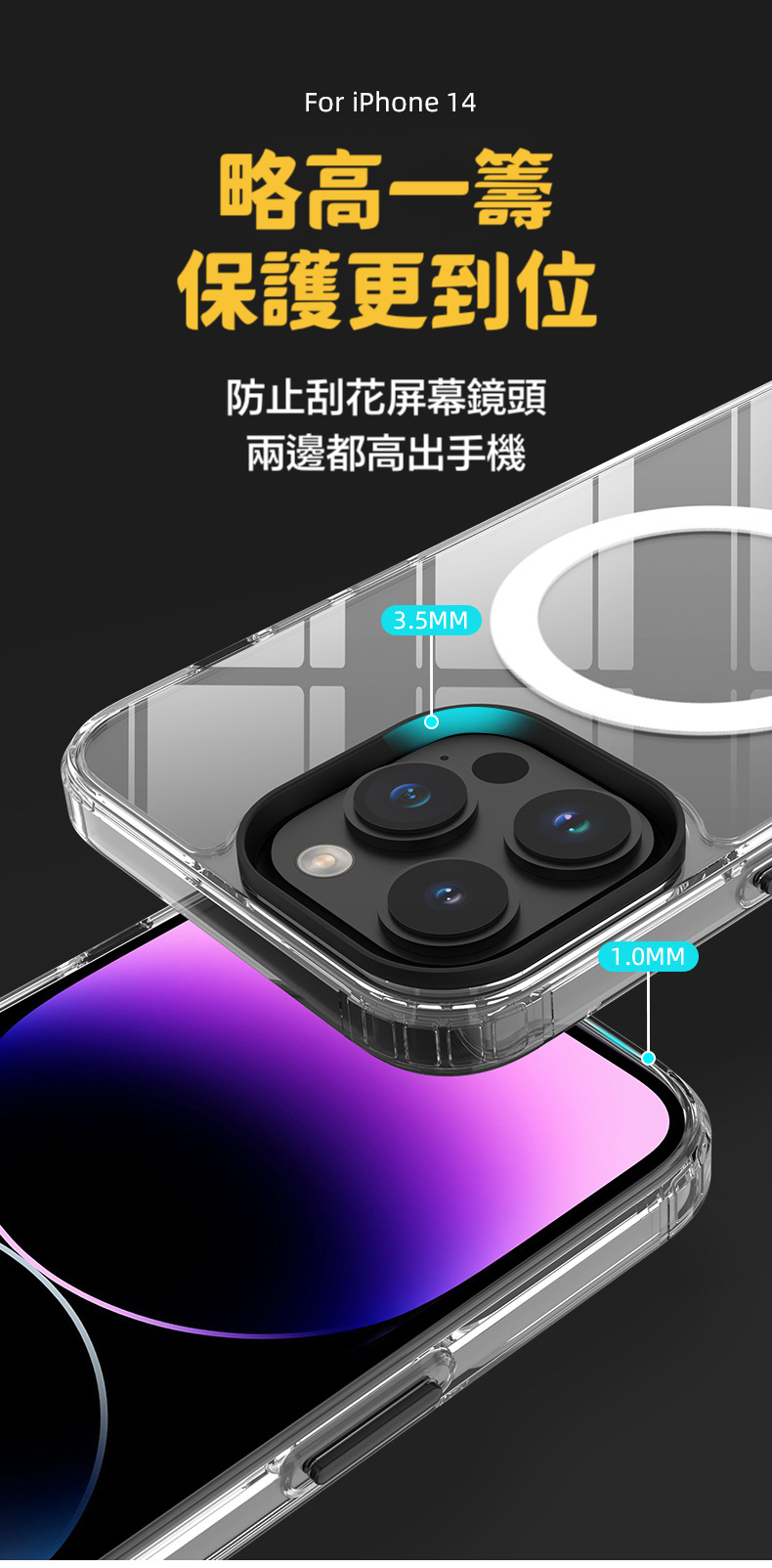 雙材質抗摔結構,正反側邊邊緣增高設計。